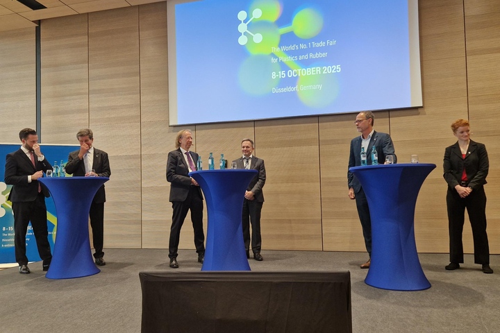![]() The podium at the opening press conference of K 2025 in Düsseldorf, Germany (Photo: PIE) |